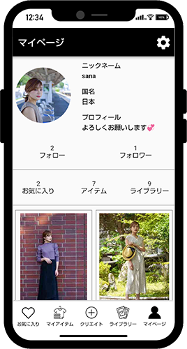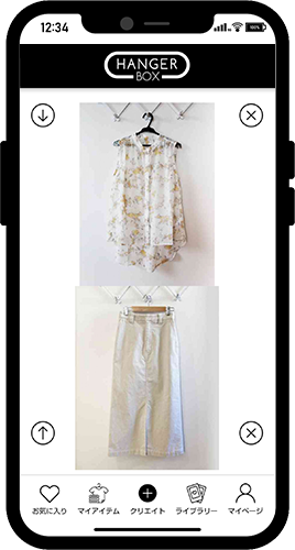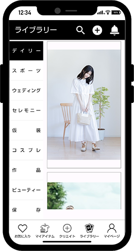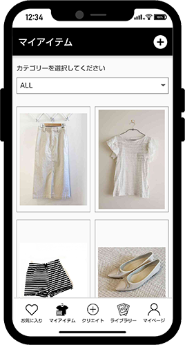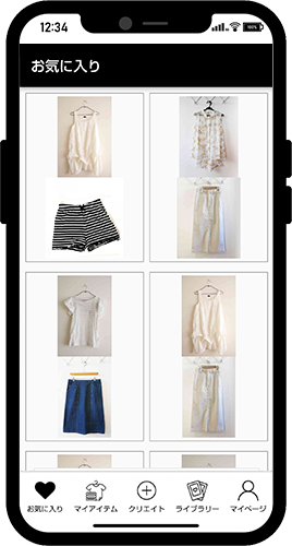 クリエイト画面でお気に入りに登録したコーディネート画像が表示されます。